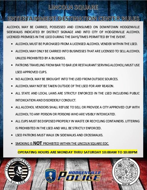 The Entertainment Destination Center (EDC) is a project to draw people to Hodgenville's downtown, strengthens existing local businesses, and attracts new entrepreneurs. This EDC boosts existing restaurant and hospitality industries by allowing customers to take to-go alcoholic drinks in designated cups from participating businesses and stroll our historic streets, browse the windows of our local businesses, and partake in outdoor events.
