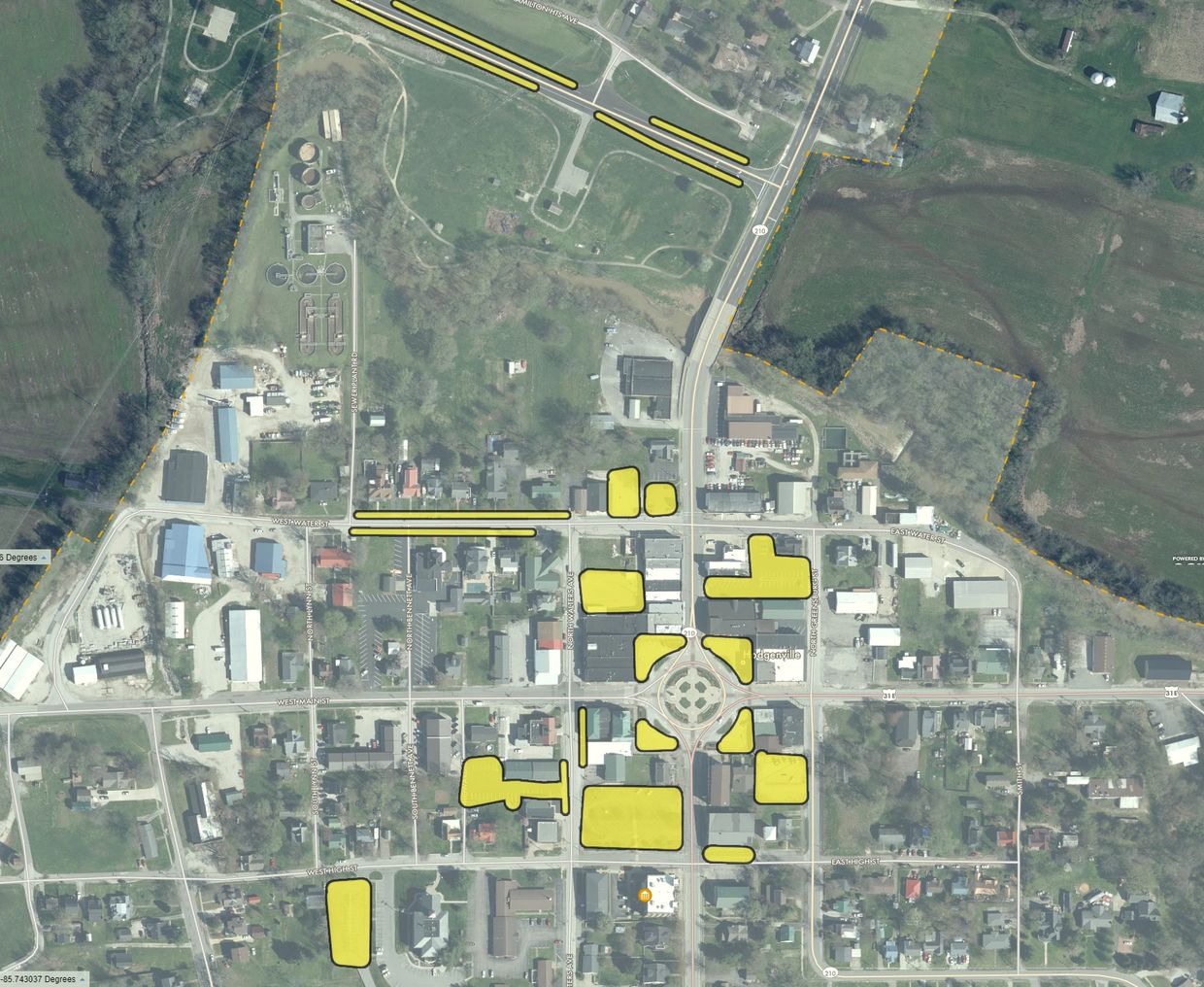 Areas marked in yellow are designated parking areas around downtown Hodgenville. NOTE: Some areas may not be accessible during events
